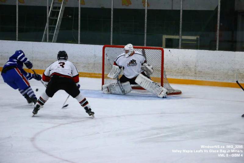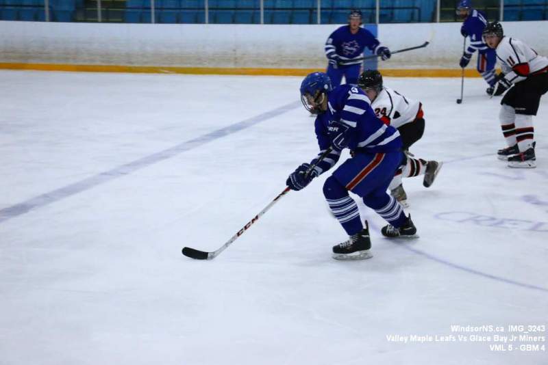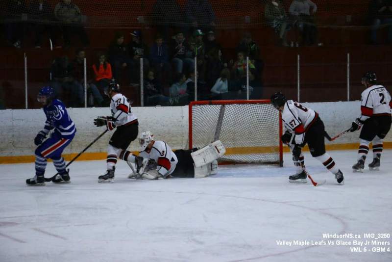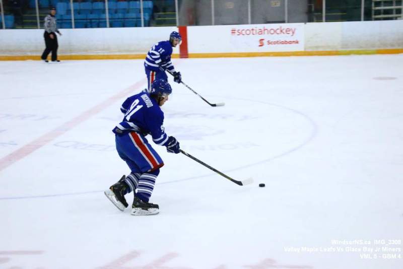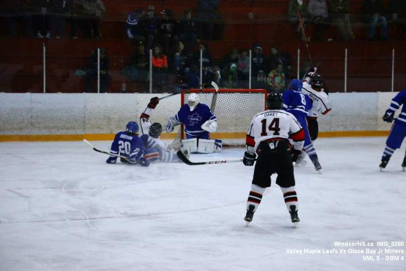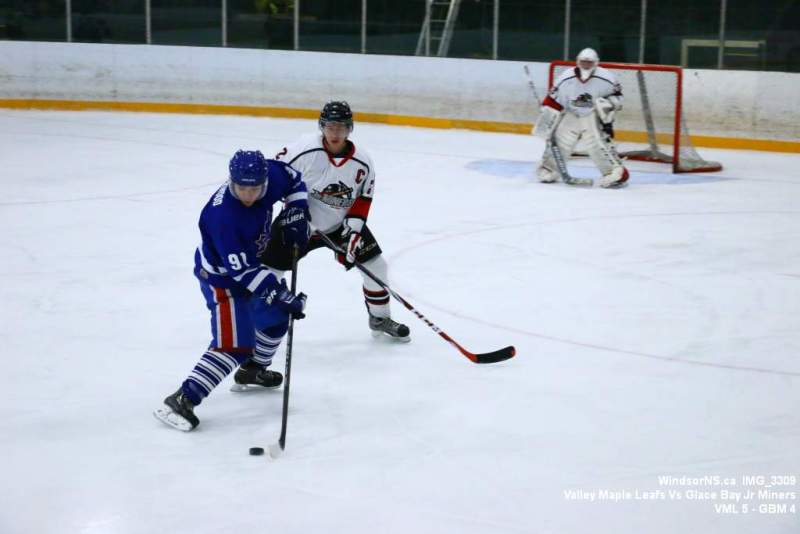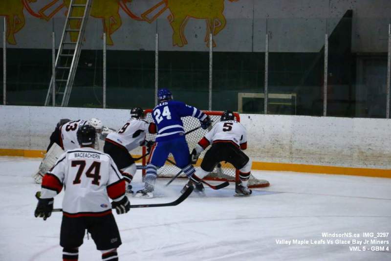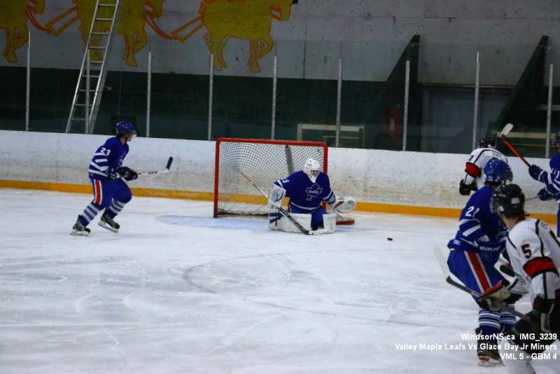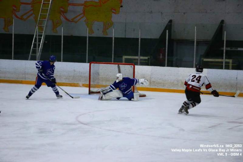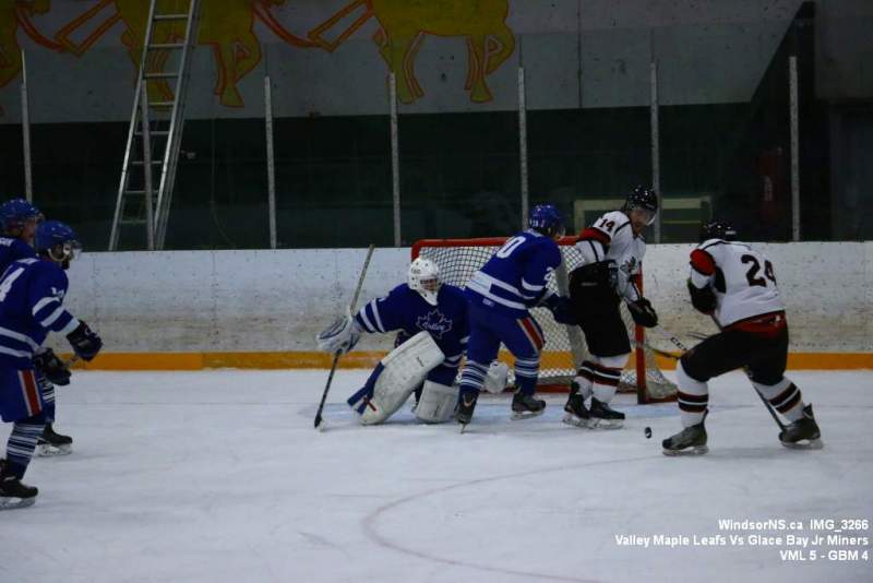 Oct. 30 Windsor NS, It was a back and forth game (up and down the ice), as the Valley Maple Leafs (Junior “B” Fred Fox Division), secured an early lead never falling behind to take a win over the Glace Bay Jr Miners (Sid Rowe Division) on Friday night at the Hants County Exhibition Arena in Windsor NS.Andy Woolaver reported, “a great crowd on hand tonight to watch the VML versus the Sid Rowe Division leaders, Glace Bay Jr Miners. Valley went up by two in the first and while Glace Bay was able to tie it, the home squad never trailed. Backed by a great effort in goal by Chris Clokie and good determined two way play by all three lines and defense pairings, Valley win it 5 – 4.