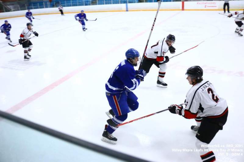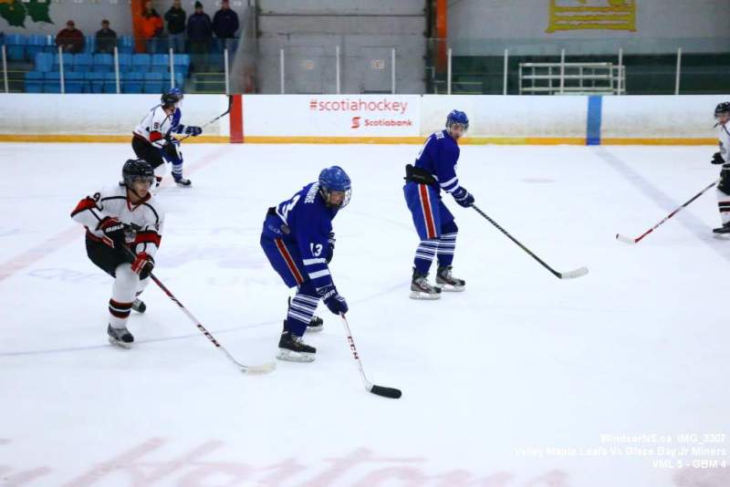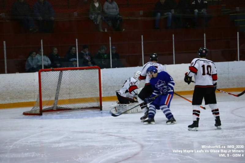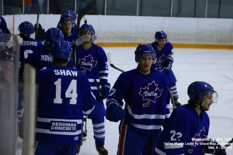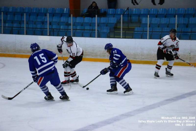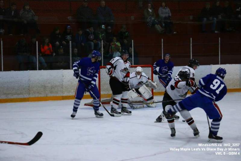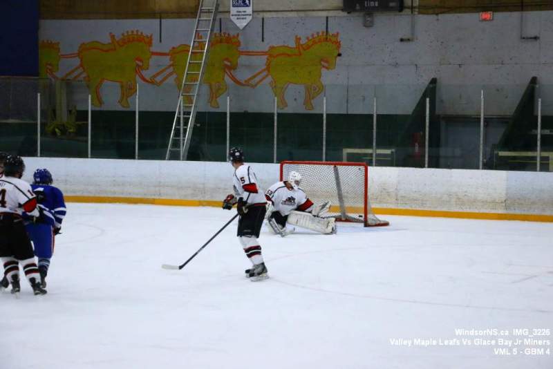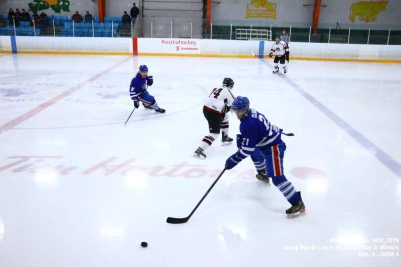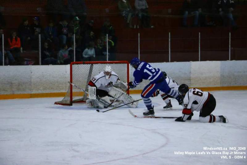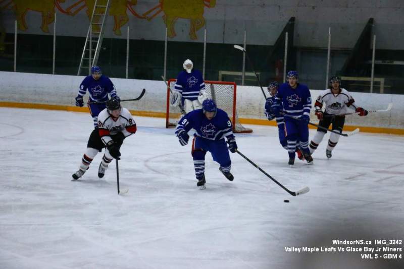 Oct. 30 Windsor NS, It was a back and forth game (up and down the ice), as the Valley Maple Leafs (Junior “B” Fred Fox Division), secured an early lead never falling behind to take a win over the Glace Bay Jr Miners (Sid Rowe Division) on Friday night at the Hants County Exhibition Arena in Windsor NS.Andy Woolaver reported, “a great crowd on hand tonight to watch the VML versus the Sid Rowe Division leaders, Glace Bay Jr Miners. Valley went up by two in the first and while Glace Bay was able to tie it, the home squad never trailed. Backed by a great effort in goal by Chris Clokie and good determined two way play by all three lines and defense pairings, Valley win it 5 – 4.