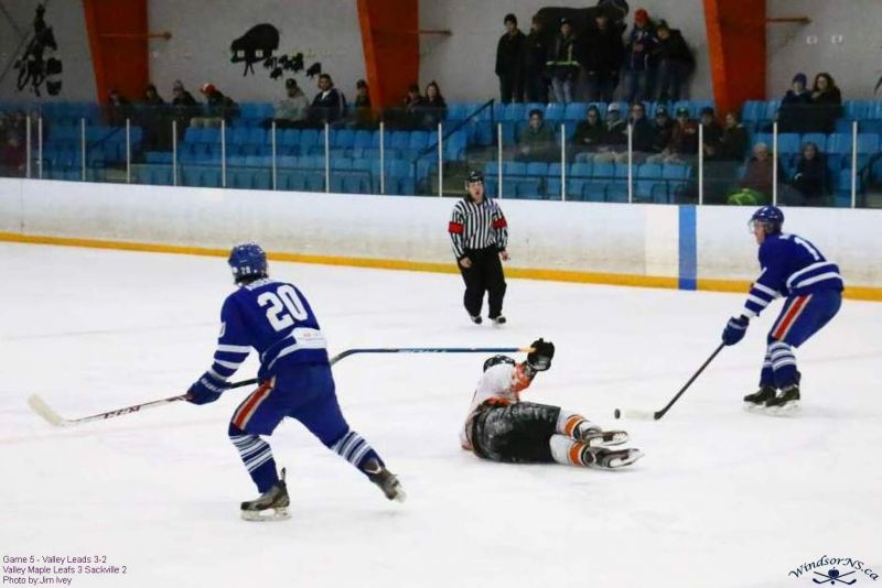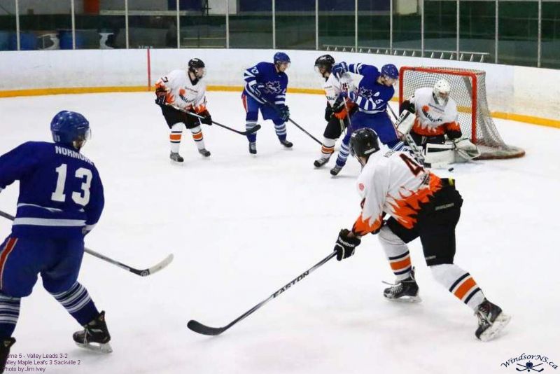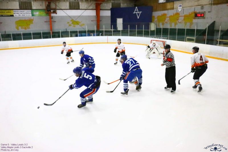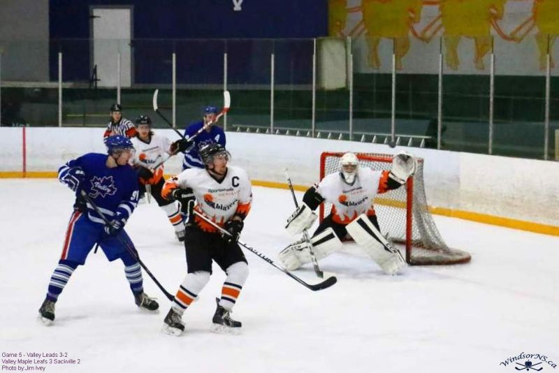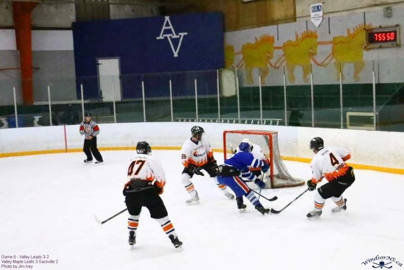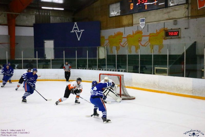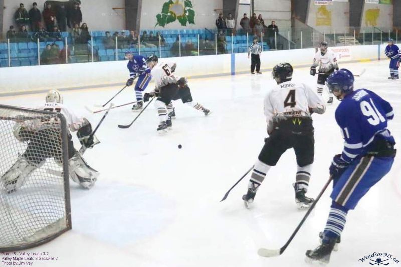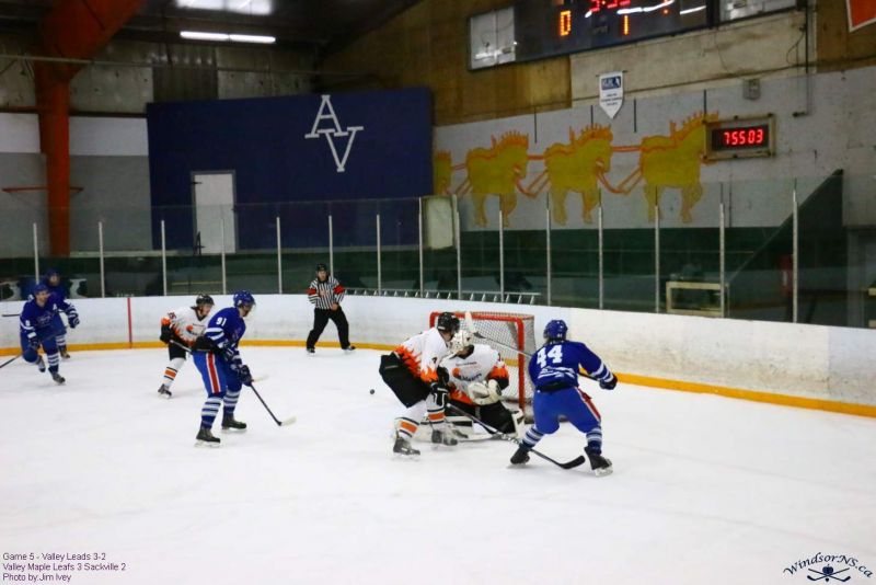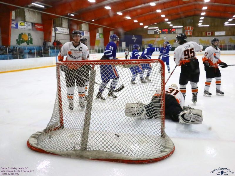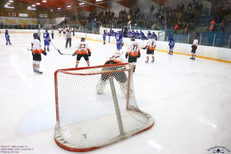 With just a few minutes left in the 3rd period, Valley lead the game 2 goals to 1 Sackville pulled their goalie for the extra man with just over a minute to play. Valley however scored an empty net goal to take a 3 to 1 lead. With 27 seconds left Sackville scored on a screen shot to tighten the gap. Valley was able to hang on to the victory and travels to Sackville on Monday night for what could be a deciding game in the series.